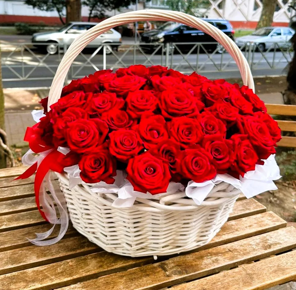 Красные розы в корзине — идеальный подарок для самых важных событий!