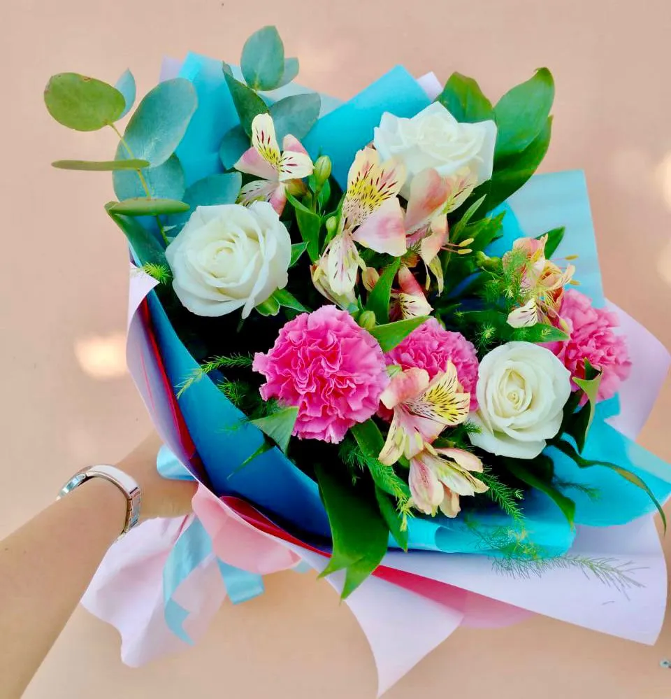 Роза ,гвоздика, альстромерия, эустома, зелень, упаковка, лента