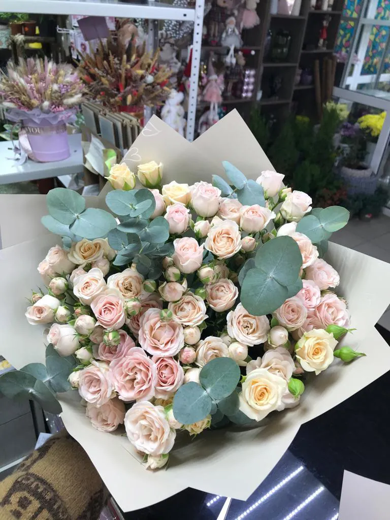 Кустовые розы, зелень, упаковка,лента |