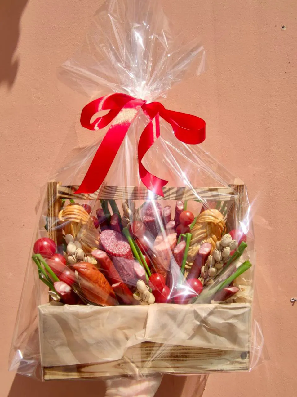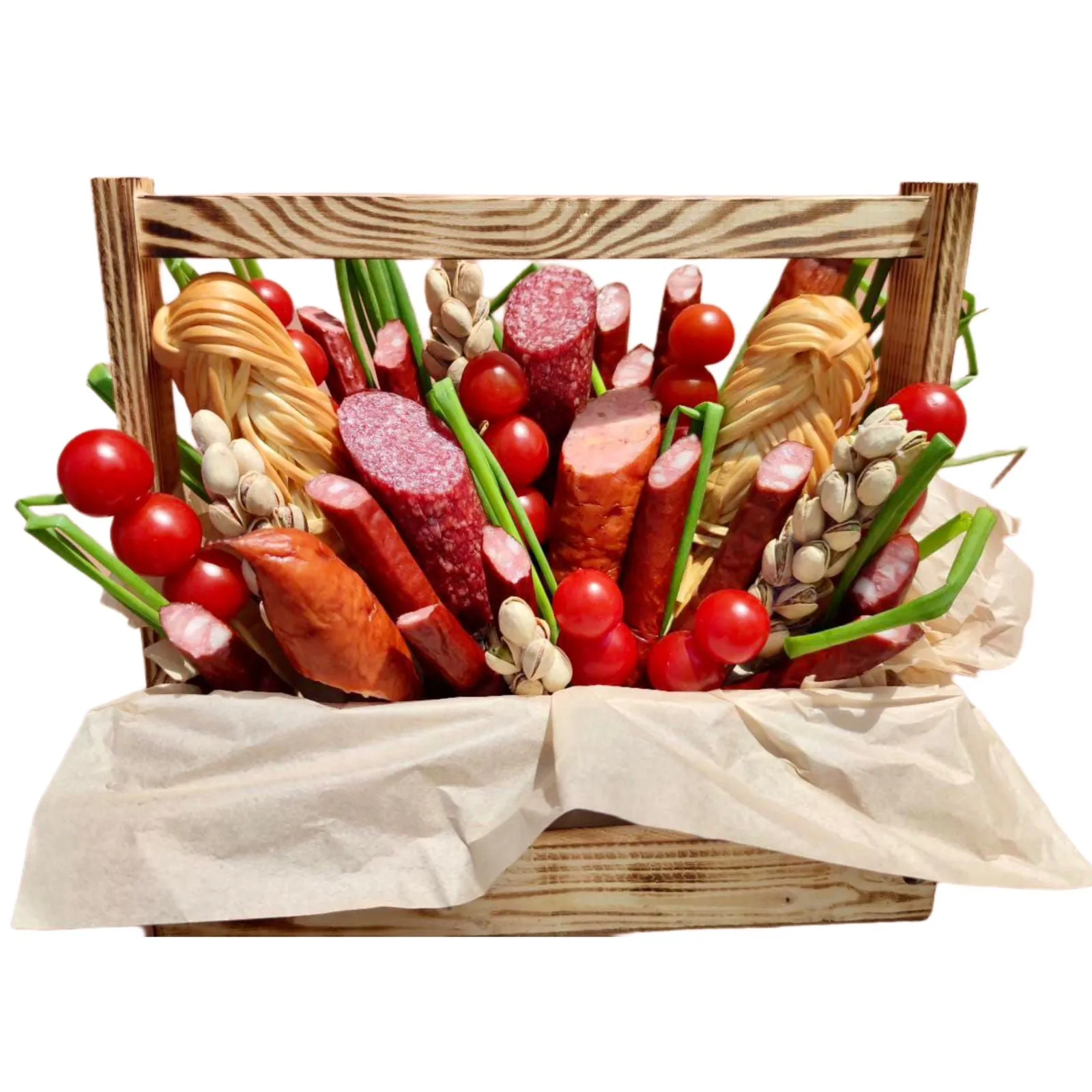 Состав: колбаса, хлеб, сыр, перец, черри, колбаски, корзина.
