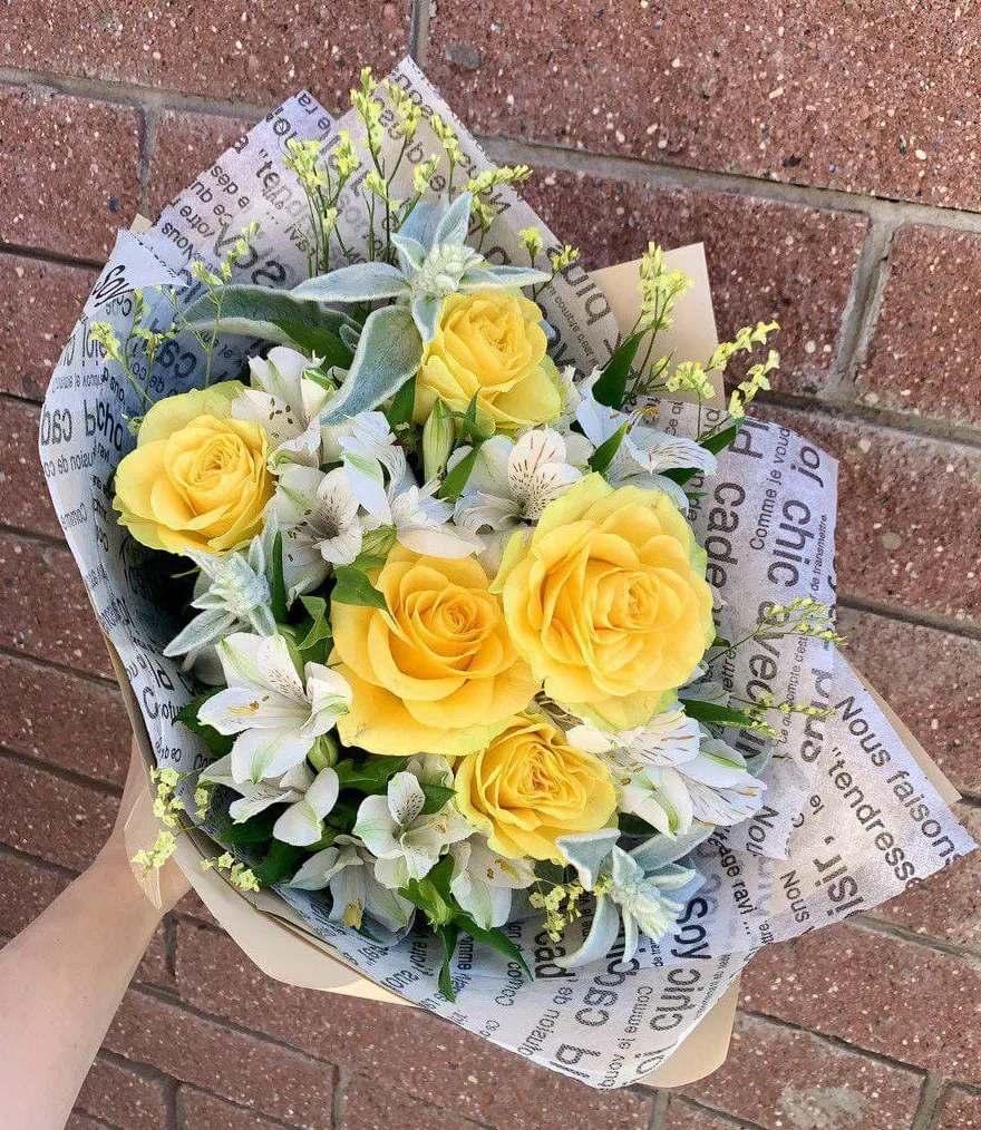В нежной композиции букета переплетаются яркие ноты желтых роз, символизирующих солнце и радость. Их мягкие лепестки излучают тепло и жизненную силу, притягивая взгляды и поднимая настроение. Среди них танцуют свободные побеги альстромерий, привнося в букет легкую экзотику и яркие акценты. Эти цветы, словно маленькие солнечные светила, дарят ощущение свежести и бодрости.